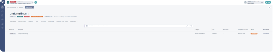 - Clear status indicators: Matters show “Outstanding undertakings” or “Undertakings complete” in multiple locations, including the workspace details panel.